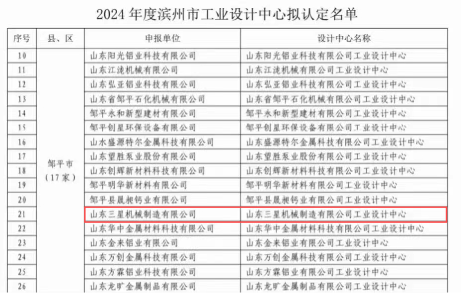 近日,濱州市工信局對(duì)《2024年度濱州市工業(yè)設(shè)計(jì)中心擬認(rèn)定名單》進(jìn)行公示,山東三星集團(tuán)機(jī)械公司通過濱州市工業(yè)設(shè)計(jì)中心認(rèn)定。